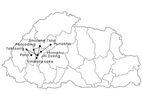 The Druk Path trek in Bhutan is a moderately tough trek from Paro to Thimphu and remains one of the most popular trekking trails in Bhutan. The trek runs up to high altitudes but walking distances between the camps are not too long. The trail passes through thick alpine jungles, rhododendron trees and along placid lakes. Every day, you will drink in fabulous views of valleys, lakes and snowcapped mountains. The sight of mighty Himalayan ranges such as the Gangkar Phuensum and Mount Jhomolhari will exhilarate your soul. Naturally, the sunsets and sunrises are also most mesmerizing. A major highlight of the trek is the halt at Phadjoding monastery, from where you will enjoy spectacular views.